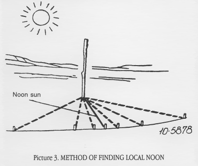 Local noon can be determined by using a vertical pole with a length of 0.51.0 meter; vertical alignment of the pole is checked with a plumb made of parachute line and a tied stone. (Picture 3)