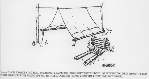 - Picture 7: How to make a two-sided shelter using parachute fabric. Stretch one shroud line between two trees, throw the parachute fabric over this shroud line and tie the ends with the help of additional shroud lines to the poles.