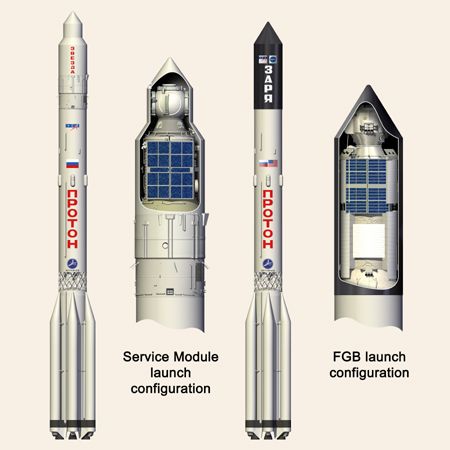 The two main rockets involved in the Russian ISS program to date have been variants of the Soyuz and Proton rockets. The Soyuz launches the manned Soyuz spaceships and crews, and the unmanned Progress cargo ships. The Proton has been used to launch heavy modules for the Russian segment. Both are featured here, and both have been launched from pads at Baikonur Cosmodrome in Kazhakstan.