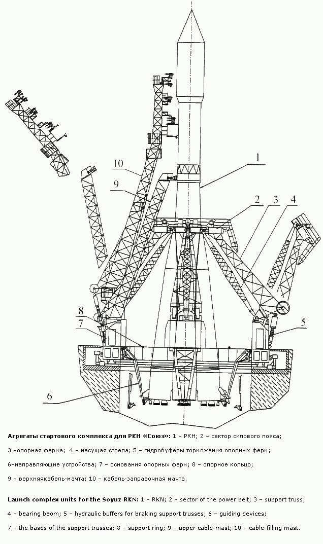 - Soyuz launch complex diagram (75 KB), from “Features of Simulation of Bearing Structures Units of Launch Complex for Space Rockets Family Soyuz” (in Russian).