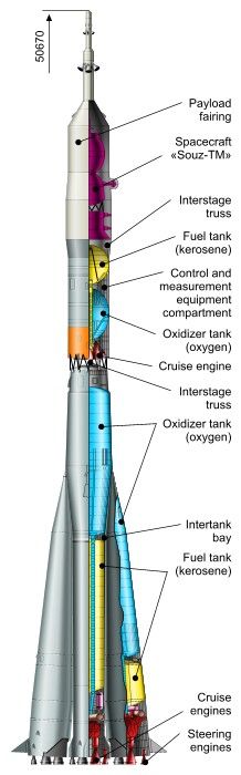 Structurally, the Soyuz-U launch vehicle is designed according to the longitudinal-transverse division of rocket stages. At the first stage of the flight, the engines of the four side and central blocks operate; at the second, after separation of the side blocks, only the central block engine.