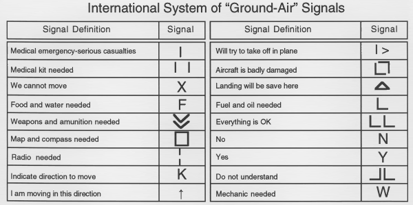 You can report about the health of your crew and necessary help to the search plane/helicopter using the International System of “Ground-Air” Visual Signals which is illustrated on pages 9-10.