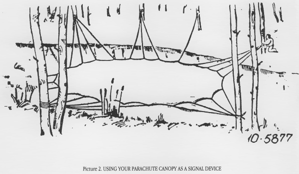Construct a parachute canopy signal (Picture 2). Tie the large sections of parachute fabric to the tops of high trees or stretch the canopy out as identification: or place the canopy over the bed of a small creek. If you have landed in the forest and the parachute canopy has hung in a tree, do not remove it because it is beautifully seen from above.