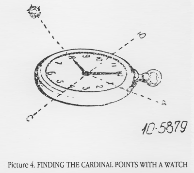 Place your watch horizontal and turn it until the big hand points towards the sun. Draw mentally the line across the center of the watch face and the digit 1 (direction A). The bisector of the angle between this line and the big hand shows north-south direction; notice that the south is to the right from the sun before noon and it is to the left afternoon (Picture 4).
