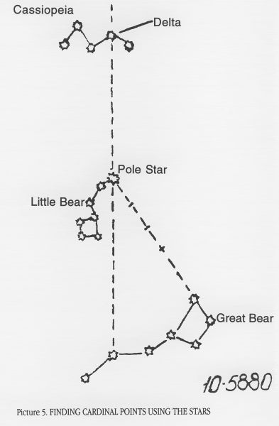 In the northern hemisphere the north direction can be found with the pole star which is situated approximately over the north pole. Locate in the sky the Great Bear Constellation which has a typical shape of a scoop with a grip. Draw mentally a straight line from one end star to the other. Continue mentally this line and mark on it five (5) times the distance between two end stars. A bright star will be found on the end of the fifth segment, this star is called the Pole Star. The direction to the Pole Star corresponds to the northern direction (Picture 5).