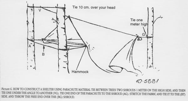 - Picture 6: How to construct a shelter using parachute material. Tie between trees two shrouds 1 meter on the high side, and then tie one under the angle to another (VG). Tie one end of the parachute to the shroud (AG). Stretch the fabric and tie it to the (BT) side, and throw the free end over the (BG) shroud.