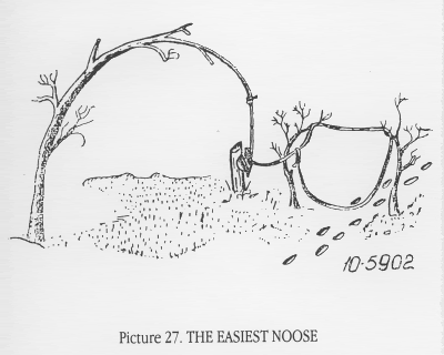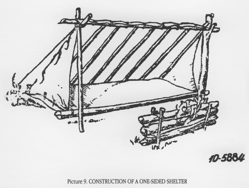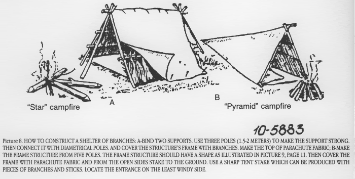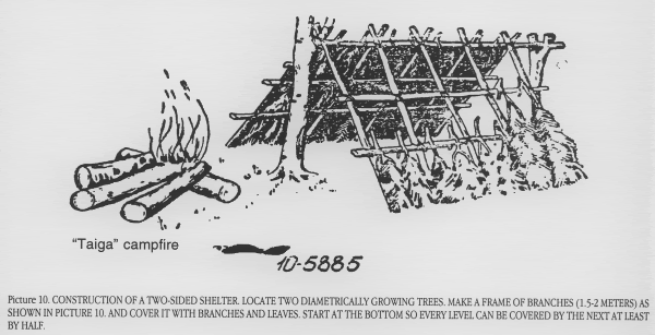 - Picture 10: Construction of a two-sided shelter. Locate two diametrically-growing trees. Make a frame of branches (1.5-2 meters) as shown in Picture 10, and cover it with branches and leaves. Start at the bottom so every level can be covered by the next at least by half.
