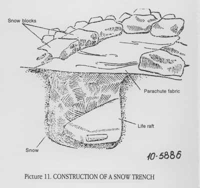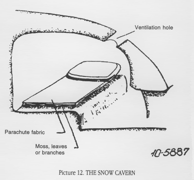In a snow hill with a depth of 1-1.5 meters deep, dig a trench. It should have a width which would be enough for one or two people. Place the bottom of the inflatable rubber raft up. Inflate it firmly and place it on the floor. Make a roof from parachute fabric and fasten it with blocks of ice or snow (Pic. 11).