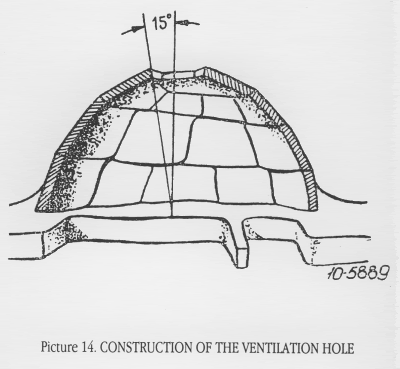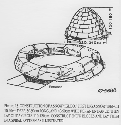 - Picture 13: Construction of a snow “igloo”. First, dig a snow trench 10-20 cm deep, 50-90 cm long, and 40-50 cm wide for an entrance. Then layout a circle 110-120 cm. Construct snow blocks and lay them in a spiral pattern as illustrated.