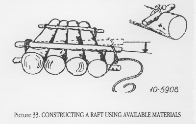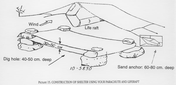 - Picture 15: Construction of shelter using your parachute and liferaft.