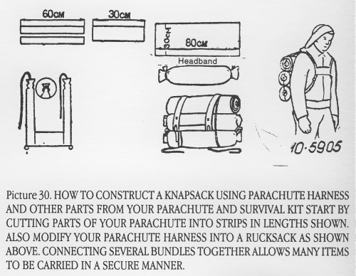 - Picture 30: How to construct a knapsack using parachute harness and other parts from your parachute and survival kit. Start by cutting parts of your parachute into strips in lengths shown. Also modify your parachute harness into a rucksack as shown above. Connecting several bundles together allows many items to be carried in a secure manner.
