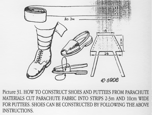- Picture 31: How to construct shoes and puttees from parachute materials. Cut parachute fabric into strips 2-3 m and 10 cm wide for puttees. Shoes can be constructed by following the above instructions.