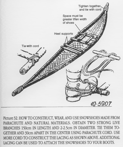 - Picture 32: How to construct, wear and use snowshoes made from parachute and natural materials. Obtain tow strong live branches 150 cm in length and 2-2.5 cm in diameter. Tie them together and 30 cm apart in the center using parachute cord. Use more cord to construct the lacing as shown above. Additional lacing can be used to attach the snowshoes to your boots.