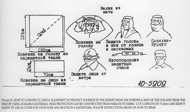 - Picture 34: How to construct useful equipment to protect yourself in the desert from the powerful rays of the sun and from the heat by using available materials. Head protection can be constructed from parachute fabric. Cut a length of 15-20 cm and keep it handy to use as cover for your nose and mouth in a sandstorm. Follow instructions above on how to wear.