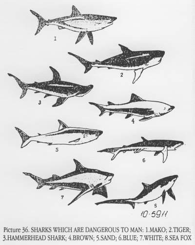 There are a lot of different kinds of sharks in the tropical oceans and seas, some of them (blue, white, tiger, hammerhead, sand, seafox, brown) can attack people (Picture 36).