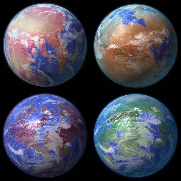 I had a go at generating some more alien exoplanets in GIMP last weekend, based on some tutorials at Cartographers’ Guild. I am still muddling through the process, but am getting better at it. The appearance is more of a stylized satellite image rather than 3D photorealistic; I don’t know how to get the latter effect. The top left planet is the original one I mentioned in my 23/11/2013 entry.