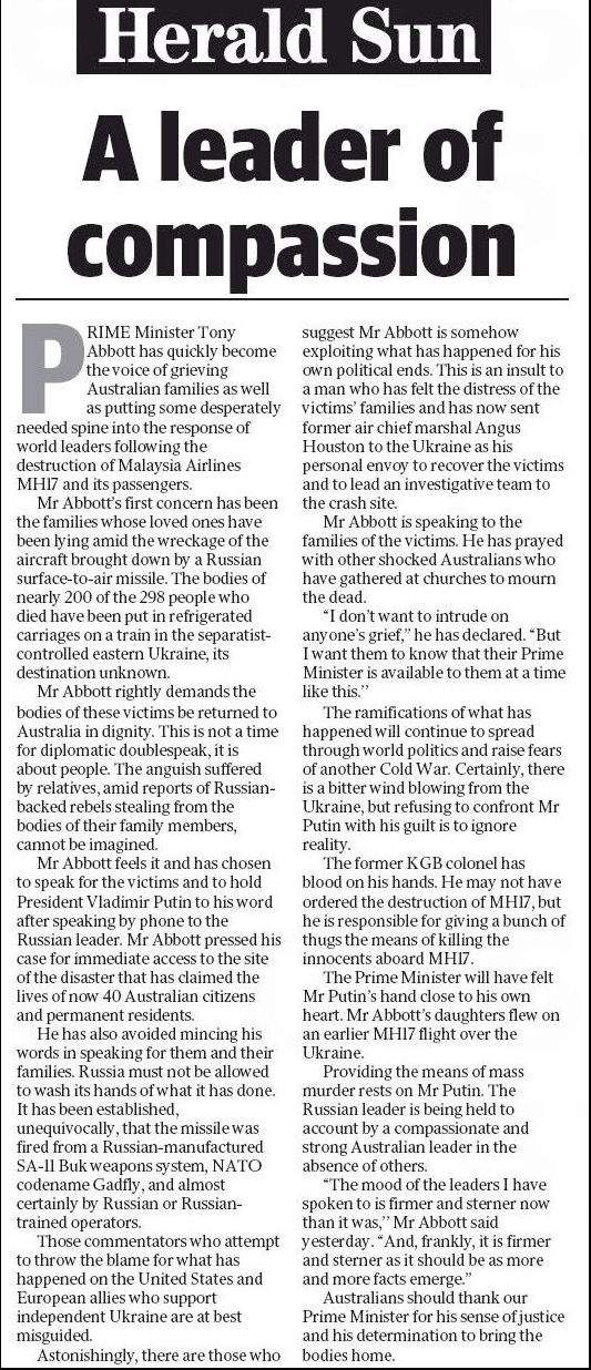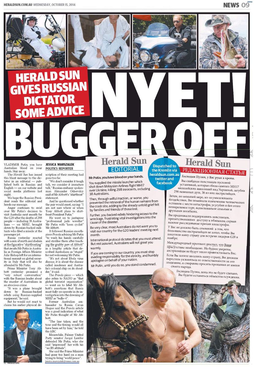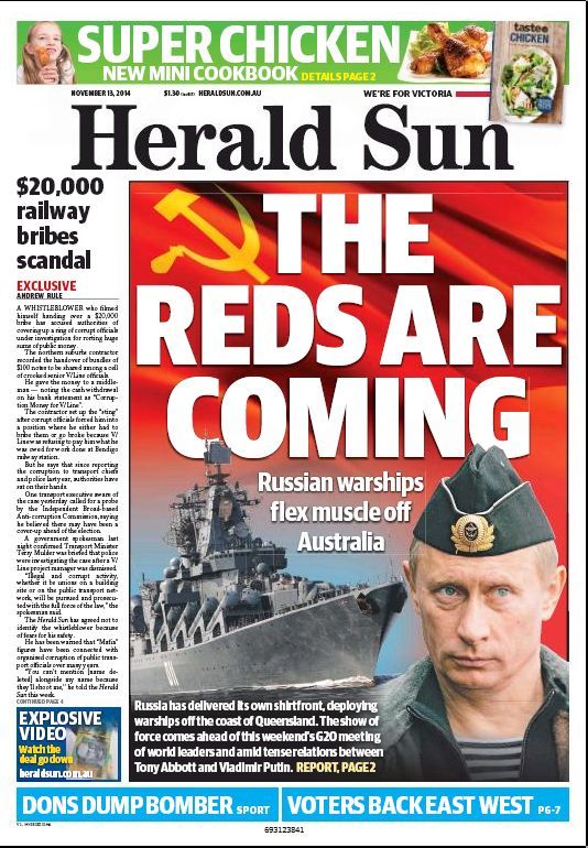 The Herald-Sun was scaremongering again yesterday with a ridiculous tabloid headline (“The Reds are coming”) – more Russophobic nonsense! The ships were still in international waters, so it’s not like they turned up in Sydney Harbor.