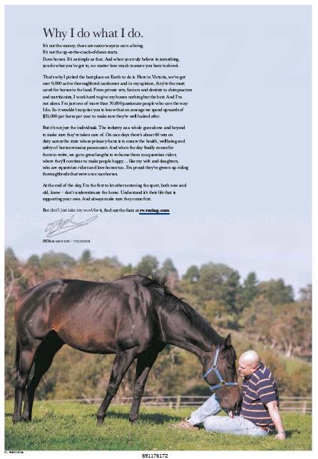 With the Melbourne Cup to run next week, the media is again full of tedious propaganda for horseracing. There was an ad in the Herald-Sun last week featuring the industry in a very positive light: