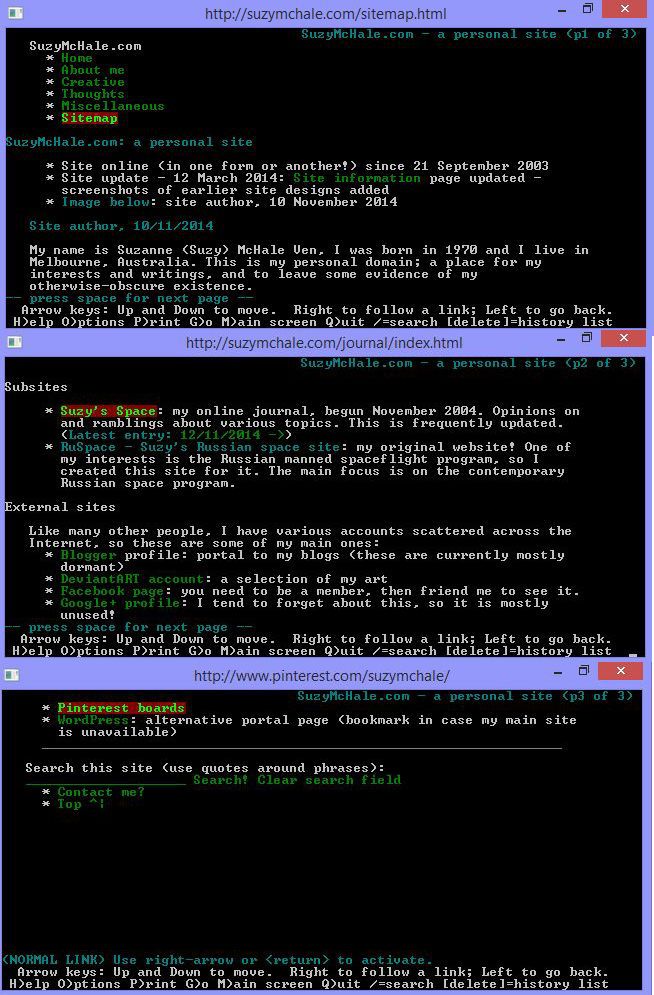 One way I test my website is to view it through a text-only browser, such as Lynx (portable version). This is a useful way of seeing how accessible a site is. Mine is reasonably straightforward to navigate (as much as I can ascertain; I don’t know of any blind people who might use it). I also got my website to validate at the W3C validator.