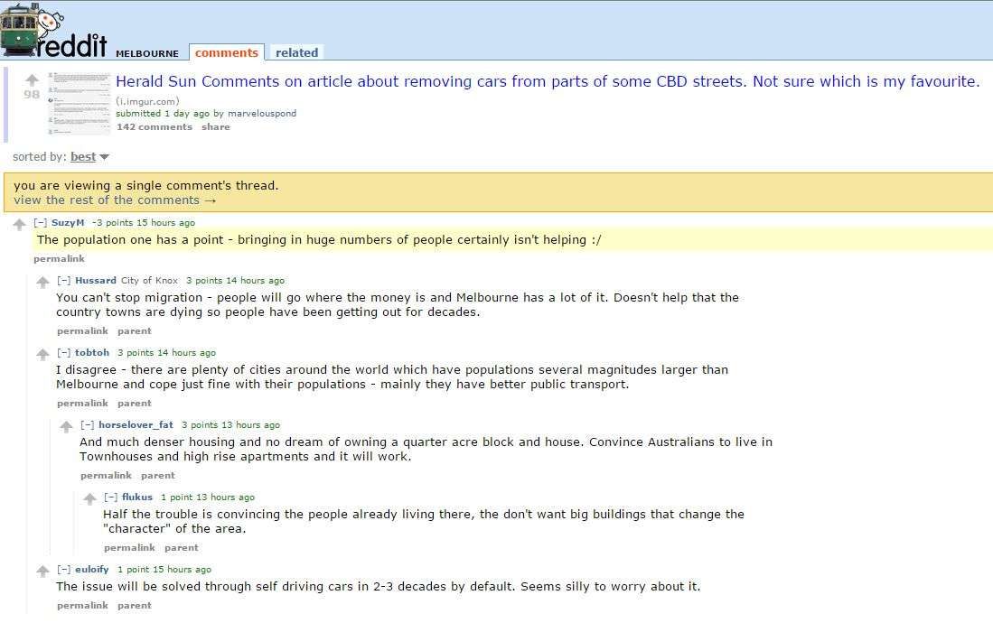 I made another comment this week (screenshot) at r/Melbourne on Reddit that predictably got downvoted, given the youthful demographics of that subreddit. The comment in question from the original Herald-Sun comments screenshot: