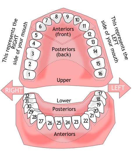 Teeth: The table below records my dental work. My lower molars seem to have become the most troublesome! Recession of gums is also becoming an issue as I get older. (Diagram of teeth numbering.)