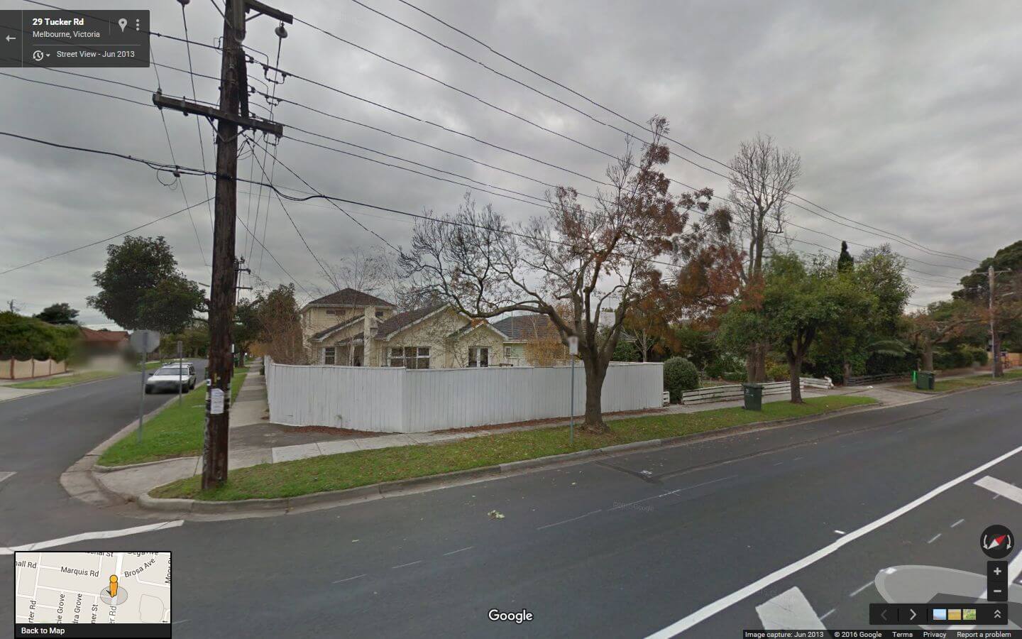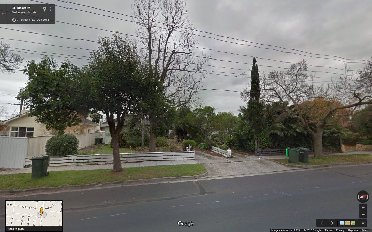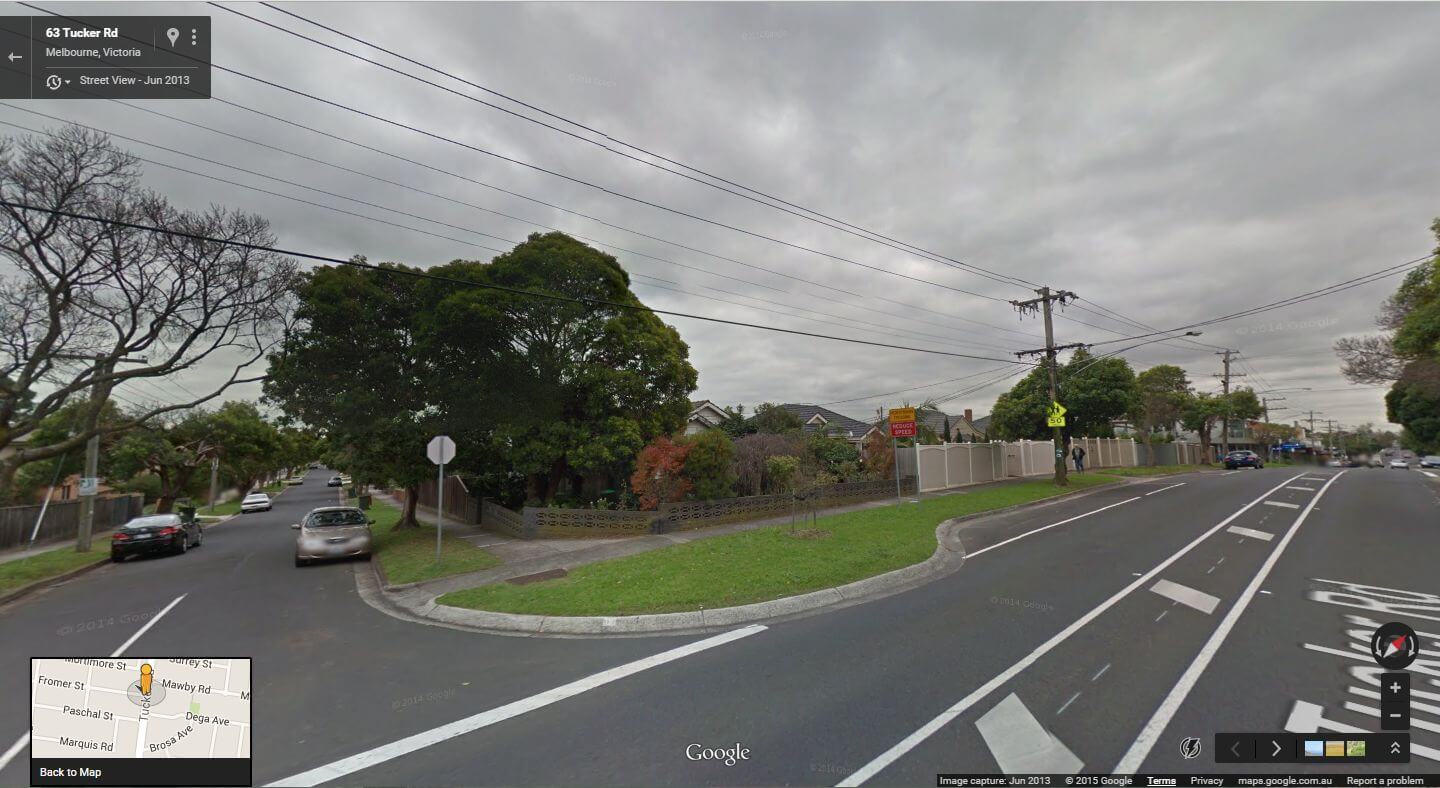 3:40 p.m.: Four more houses have been, or will be, knocked down on Tucker Road: #29 and #33 were demolished last week, and #31 in between it, a mint-green weatherboard, is to follow soon. An old man used to live in #31 who was meticulous about keeping the garden tidy, but he moved out a few years ago and the house was rented out and became rundown, as is too often the case now. (The Google Street View screenshots (1, 2) of the three were taken in June 2013.) They are being replaced by the usual ugly oversized duplex houses with no room for backyards or gardens; the corner block has two townhouses crammed on it. Further north up the road, #63 (165 KB) also went a couple of weeks ago; another corner block to be crammed with 2 townhouses.