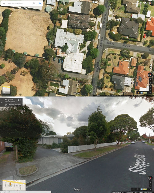 Google streetview of Patterson-Tucker Rd corner milkbar, June 2013, and a Google Maps view of the Tucker Road shopping strip