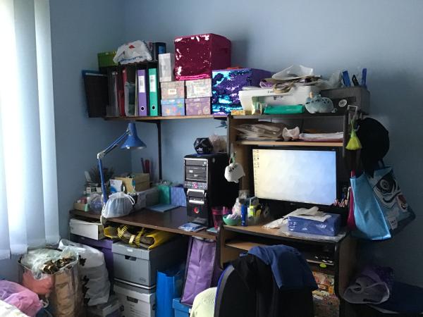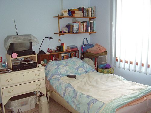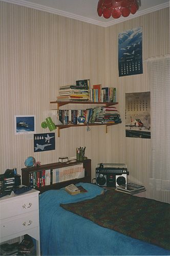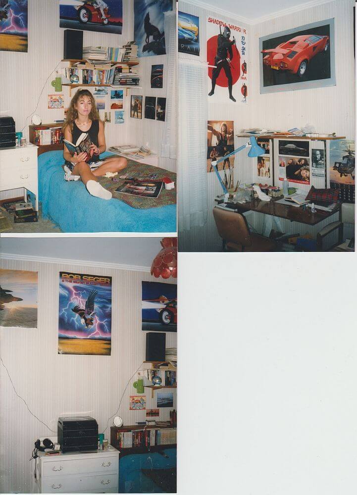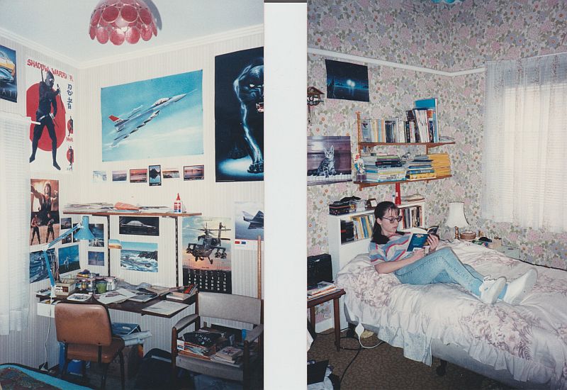 Photos of my teenage bedroom in 1988 (Michele took the one of me on my bed); my bedroom desk (no computer then!) and Michele in her bedroom, taken on the same day by me.