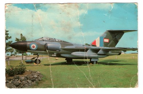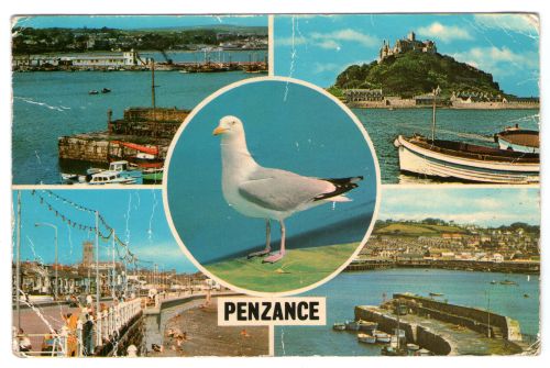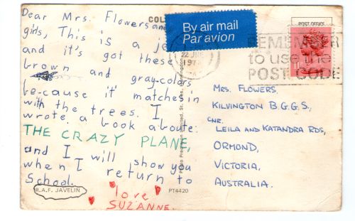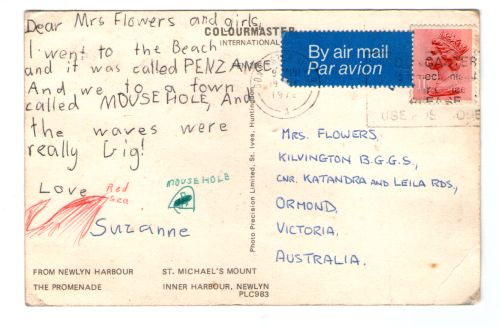 During my second holiday to England with my family to visit relatives there, I sent my school classmates two postcards. The front of the first postcard shows a RAF Javelin fighter jet, and I wrote on the back: “Dear Mrs. Flowers and girls, this is a jet and it’s got these brown and gray colors because it matches in with the trees. I wrote a book aboute sic: THE CRAZY PLANE and I will show you when I return to school. Love, Suzanne.” I can only wonder what my classmates thought of that …. The “Crazy Plane” was some sort of cartoon character I made up then, and drew (during that holiday my interest in aircraft emerged). On the second I wrote: “Dear Mrs Flowers and girls, I went to the Beach and it was called PENZANCE. And we to a town called MOUSEHOLE, and the waves were really big! Love, Suzanne.”