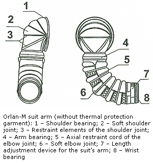 In order to provide for the spacesuit mobility freedom there are soft joints in the structural shell shoulder, elbow and knee areas. The shoulder joints are additionally equipped with cord connections for a better mobility.