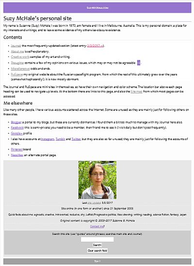 I chose the domain name because it seemed the logical choice (I am no good at inventing imaginative site names) and, though not a commercial site, the .com ending is easy to remember. An alternate choice was kosmonavtka.com, but I would be forever having to explain to people what a “kosmonavtka” was, so suzymchale.com was the more practical choice (and seeing as my spaceflight interest waned in later years, a wise one!).